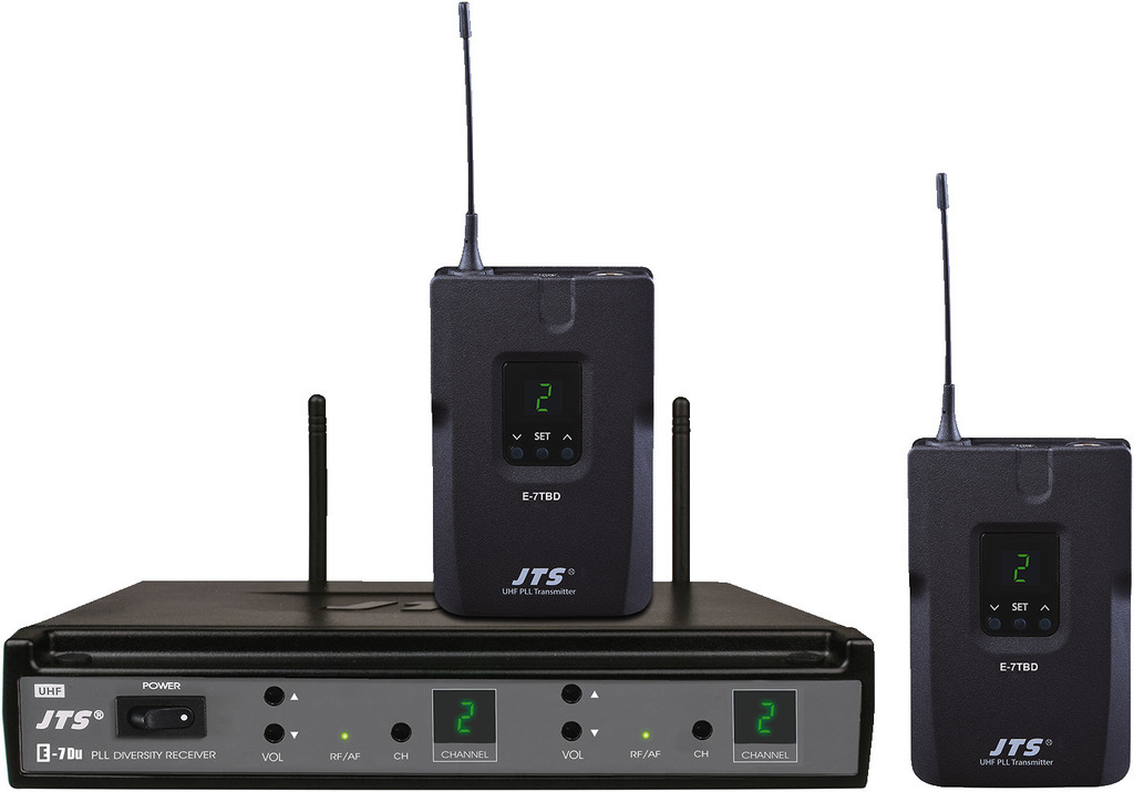 • 2-Kanal-Diversity-UHF-PLL-Empfänger E-7DU/5 • UHF-PLL-Taschensender mit Lavaliermikrofon (2er-Set) E-7TBD/5 Trägerfrequenzbereich 504-542 MHz