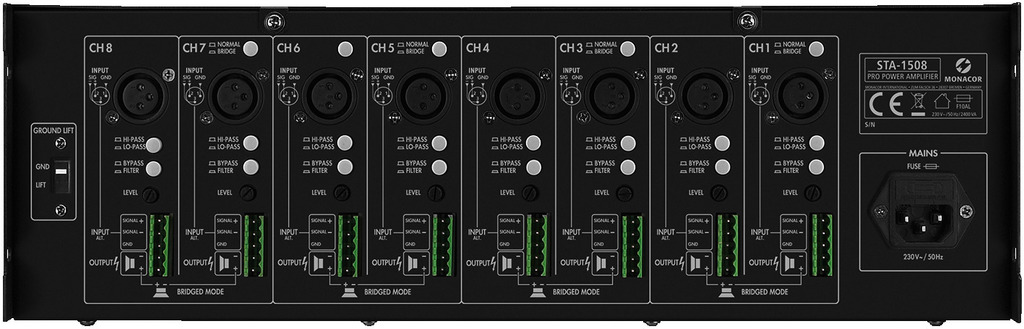 • Symmetrische Eingänge • Hochpass-, Tiefpass-Filter pro Kanal zuschaltbar • Rückseitige, manipulationsgeschützte Leveleinstellung • 8-Ω-Brückenbetrieb möglich • LED-VU-Meter und -Übersteuerungsanzeige (Clip) pro Kanal • Soft-Start • Groundlift-Schalter • Lautsprecher-Einschaltverzögerung • Lüfterkühlung • Geschützt gegen Kurzschluss, Überhitzung und Gleichspannungsüberlagerung an den Ausgängen Herstellerinformation MONACOR INTERNATIONAL GmbH & Co. KG
