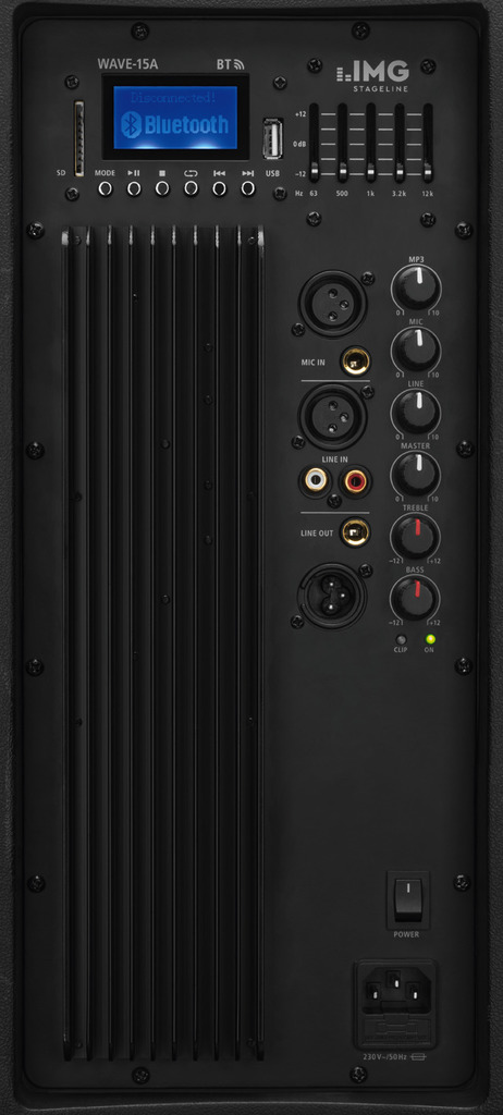 • Kompaktes 15/2-Fullrange-Bassreflex-System mit Kunststoffgehäuse • 38-cm-Bass (15") und 25-mm-Hochtonhorn (1") mit Schwingspule 34 mm (1 ⅜") • Integrierter MP3-Player mit USB/SD-Slot • Integrierter 5-Band-Equalizer zur Klangeinstellung • Bluetooth-Empfänger mit TWS (True Wireless Stereo) • IR-Fernbedienung • Symmetrischer Mic-Eingang über XLR-Buchse oder 6,3-mm-Klinkenbuchse • Line-Eingang über Cinch- oder XLR-Buchse • 2-fach-Klangregelung für Höhen und Bässe • MIX-OUT über XLR oder Klinke 6,3 mm • M8-Gewindeeinsätze zur Montageunterstützung • Stativhülse Herstellerinformation MONACOR INTERNATIONAL GmbH & Co. KG