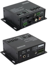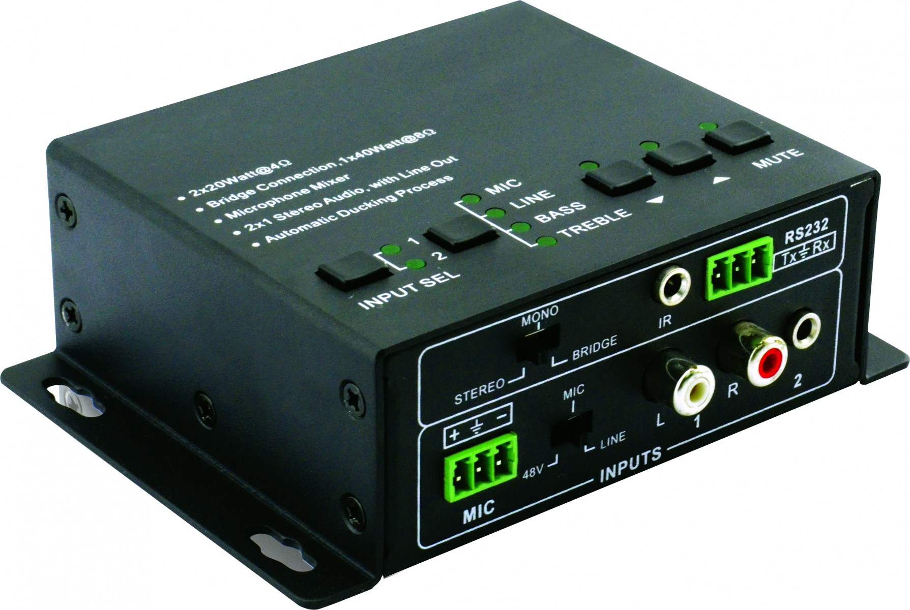 Audio Amplifier 2x20W Digitaler Verstärker (Klasse-D) mit 2 Leitungs- & 1 MIC-Eingang, der EQ-Steuerung und MIC-Mixing unterstützt. Mit 2x20W@4 Ohm als Standardausgang; kann durch Brückenschaltung auf 1x40W@8 Ohm umgeschaltet werden. IR, RS232 Steuerung.