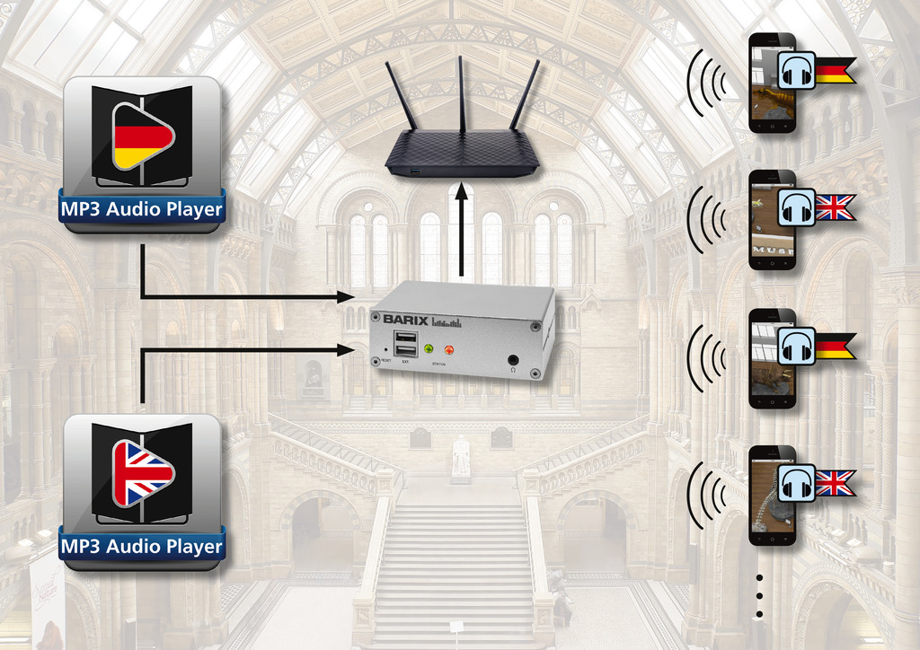 AUDIOPOINT-3 ermöglicht das Streamen von analogen Audiosignalen wie Live-Audio, Musik oder Sprache mit geringer Latenz an mehrere mobile Endgeräte und eignet sich ideal für den Einsatz in Kirchen, Museen, Hörsälen, Schulen und bei Messen oder Konferenzen.