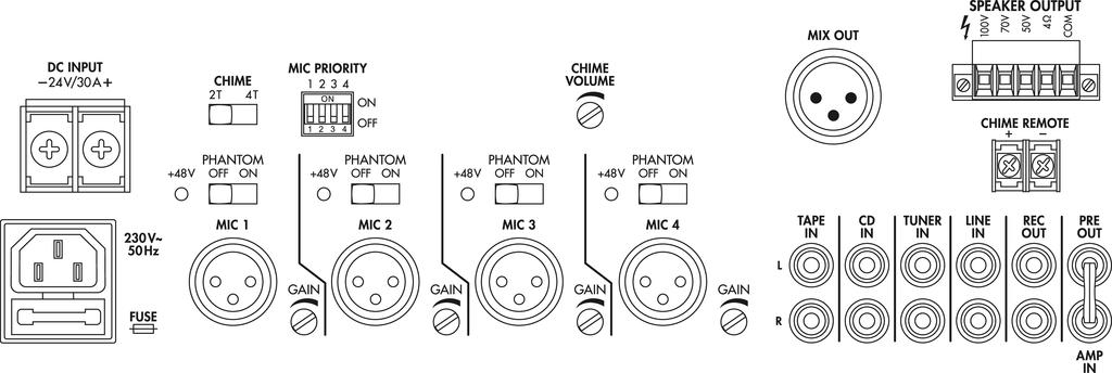 • 1 x 480 W • 4 symmetrische Mikrofon-/Line-Eingänge mit schaltbarer Priorität • 4 Stereo-Line-Eingänge • Lautsprecherausgänge über Schraubkontakte • Symmetrischer Line-Ausgang • Record-Ausgang • Einschleifmöglichkeit für z. B. Effektgeräte, Equalizer, Feedback-Controller • Extern auslösbarer 2/4-Ton-Gong • Ein- und Ausgangspegelregler • 2-fach-Klangregelung für den Ausgang • Schaltbare 48-V-Phantomspeisung für die Mikrofon-Eingänge • Temperaturgeregelter Lüfter • Netz- oder 24-V-Notstrombetrieb • Montagewinkel abnehmbar Herstellerinformation MONACOR INTERNATIONAL GmbH & Co. KG