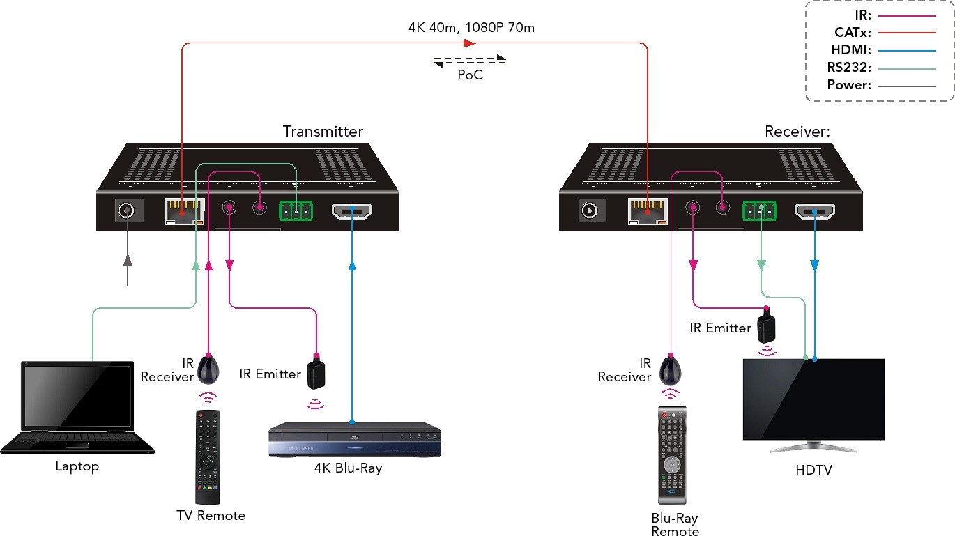 Sender/Empfänger HDMI 2.0 18 Gbps, bidirektionales IR, RS232 und CEC, ein Netzteil, HDMI 1.4 und HDCP2.2-konform