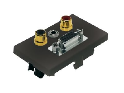 FLF Montageplatte schwarz, 63 x 38 mm, mit Metallklammern, bestückt mit 2 x Cinch (schwarz/rot) vergoldet mit Lötanschlüssen, 1 x D-Sub 15pol. "HD" Gender Changer female/female und 1 x 3,5mm Klinkenbuchse stereo