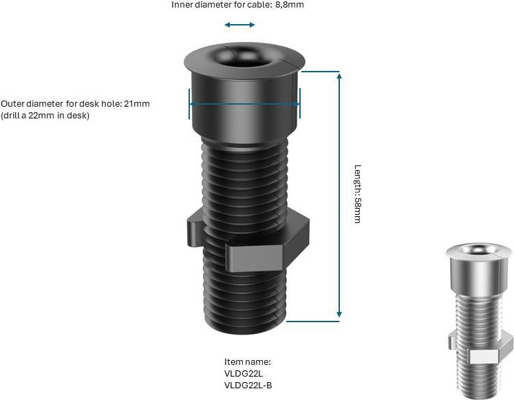 Diese Tischdurchführung erfordert ein 22 mm großes Loch im Tisch. Diese Version kann für Tischplatten mit einer Dicke von bis zu 55 mm verwendet werden. Dieser Lochdurchmesser ist so ausgelegt, dass Vivolink HDMI-, DisplayPort-, USB-C- oder RJ45- Kabelenden durch den Tisch geführt werden können, ohne das Kabel durchzuschneiden.