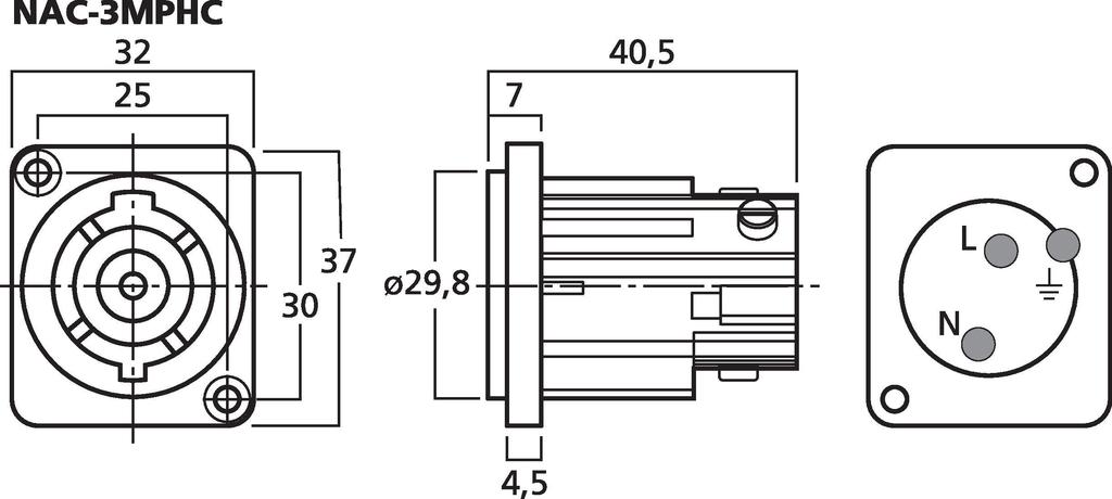 • Für den Netzanschluss mit hoher Strombelastbarkeit bis ˜ 250 V/32 A • Schraubkontakte für Erde, Phase und Nullleiter • Für Kabeladern 2,5-6 mm2 Herstellerinformation Neutrik AG