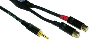 15 cm langes Stereo-Adapterkabel mit Mini-Plug 3,5 mm stereo auf 2 x Cinch-Buchsen. Die Steckverbinder haben vergoldete Kontakte.