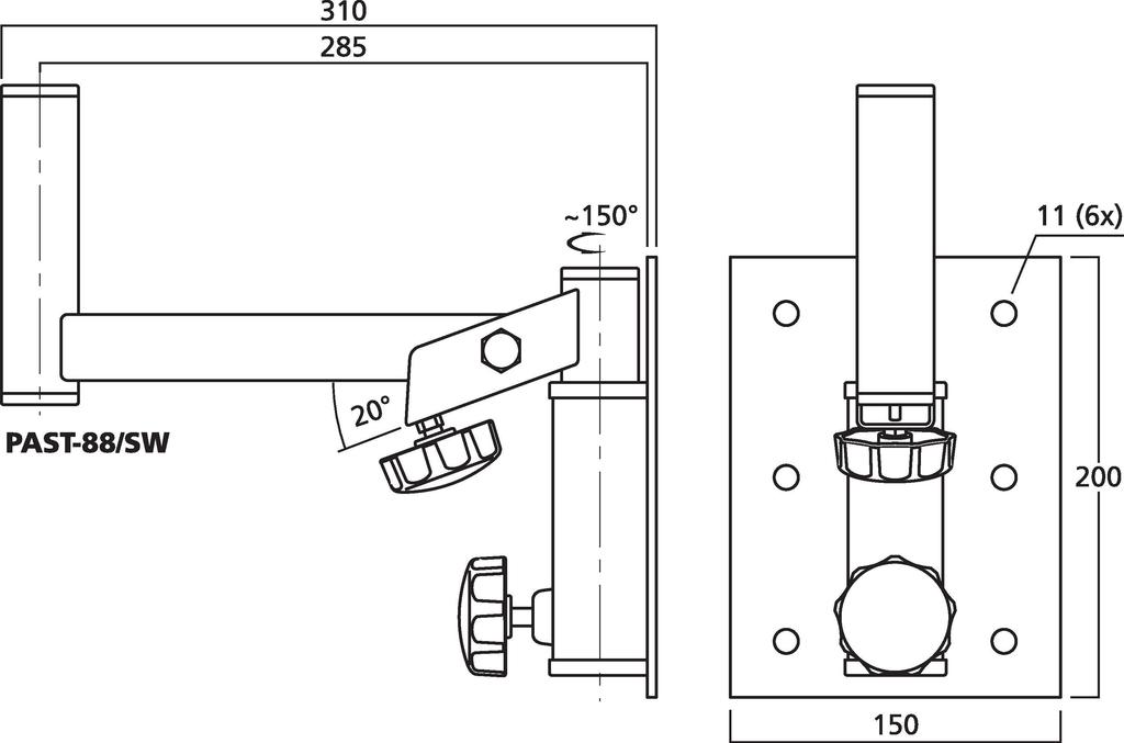 • Schwarz lackiert • Schwenkbar (ca. 150°) und neigbar (ca. 20°), mit Feststellschrauben arretierbar • Haltedorn zur Aufnahme z. B. für PA-Boxen mit Stativeinsatz sowie Träger- und Adapterplatten • Abstand zwischen Dorn und Montageplatte: 285 mm • Gesamtlänge: 310 mm • Tragfähigkeit: 20 kg Sicherheitshinweis Nur von einem Fachmann installieren lassen! Auf korrekte Verschraubung achten! Bitte passende Sicherungsseile verwenden! Herstellerinformation MONACOR INTERNATIONAL GmbH & Co. KG