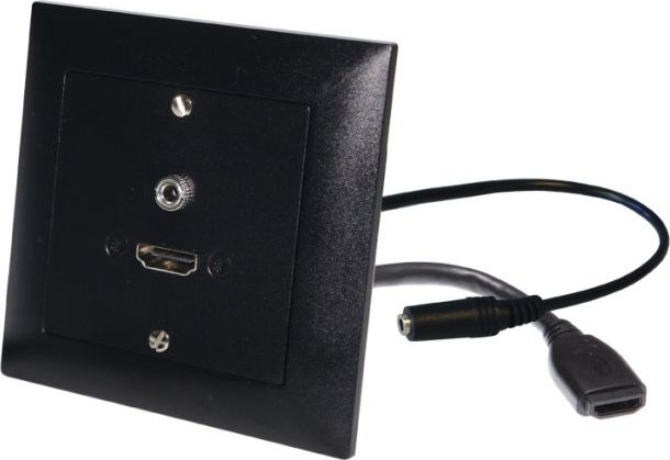 Schwarzes Unterputz-Montageset EDIZIOdue, bestückt mit einer HDMI-Kabelpeitsche female/female (ca. 10 cm), einer 3,5 mm Mini-Klinkenbuchsen-Kabelpeitsche female/female (ca. 25 cm) und einem Abdeckrahmen aus Kunststoff.