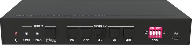 18G 2x1 Auto-Switcher mit HDMI- und USB-C-Eingängen USB3.0 Datenrate bis zu 2,8Gbit/s und 1 Ampere Leistung Eingangs-Trigger-Funktion, die Geräte von Drittanbietern über CEC oder RS232-Befehle ein- und ausschalten kann Ermöglicht das Aufladen am USB-C-Anschluss mit bis zu 40 W Unterstützt HDMI 2.0, 4Kx2K@60Hz 4:4:4, HDR 10, Dolby Vision, HDCP 2.2 Steuerbar über Tasten auf der Vorderseite und RS232