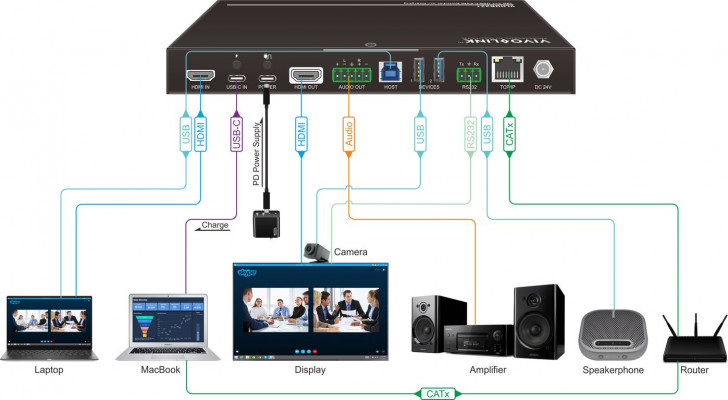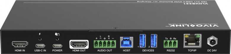 Vivolink 4K 2x1 Meeting Room HUB Der Switcher dient zum Umschalten von HDMI- oder USB-C-Eingängen auf einen HDMI-Ausgang und fungiert gleichzeitig als USB-3.0-Hub für Konferenzkameras. Er unterstützt Videoauflösungen bis zu 4K x 2K bei 60 Hz, 4:4:4, 8 Bit, 1080p und 3D. Der Switcher unterstützt Stereo- und Mehrkanal-Audio an den HDMI-Eingängen. Der Umschalter bietet mehrere Steuerungsmöglichkeiten. Im AUTO-Modus wechselt der Umschalter automatisch, manuell über die Tasten auf der Vorderseite und RS232-Befehle gesteuert werden. CEC ermöglicht die Steuerung des Anzeigegeräts über die Tasten auf der Vorderseite.