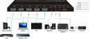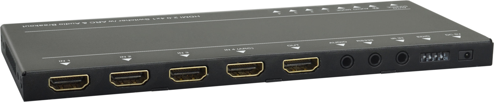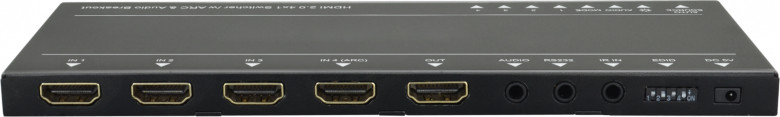 • HDMI switcher with 4 HDMI inputs and one HDMI out • Supports video resolution up to 4Kx2K@60Hz 4:4:4 HDR • 18Gbps high bandwidth • Fully compliant with the HDMI 2.0 and HDCP2.2 specifications • Supports audio return channel (ARC) • Advanced EDID management: multiple preset and user defined allowed • Controllable via RS232 and IR • Supports CEC • Provides seven LEDs to indicate the current operating status and to assist troubleshooting an installation • Firmware upgrade by Micro-USB port • RS232 control and audio line out to active speakers